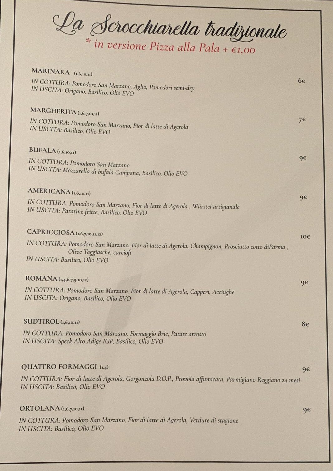 pomodoro, fior di latte, funghi, prosciutto cotto, olive, carciofi,  olio EVO
